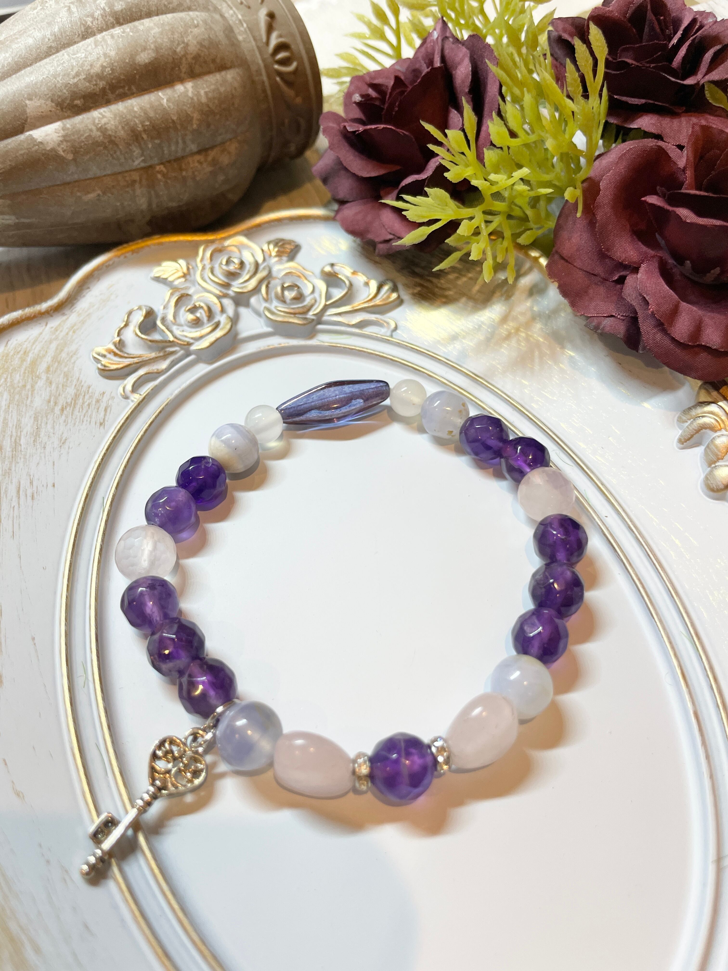 アメジスト、ローズクォーツ、ブルーレースアゲード、ホワイトオニキス、チェコガラスビーズを使用したブレスレットです(˶ᐢᗜᐢ˶)