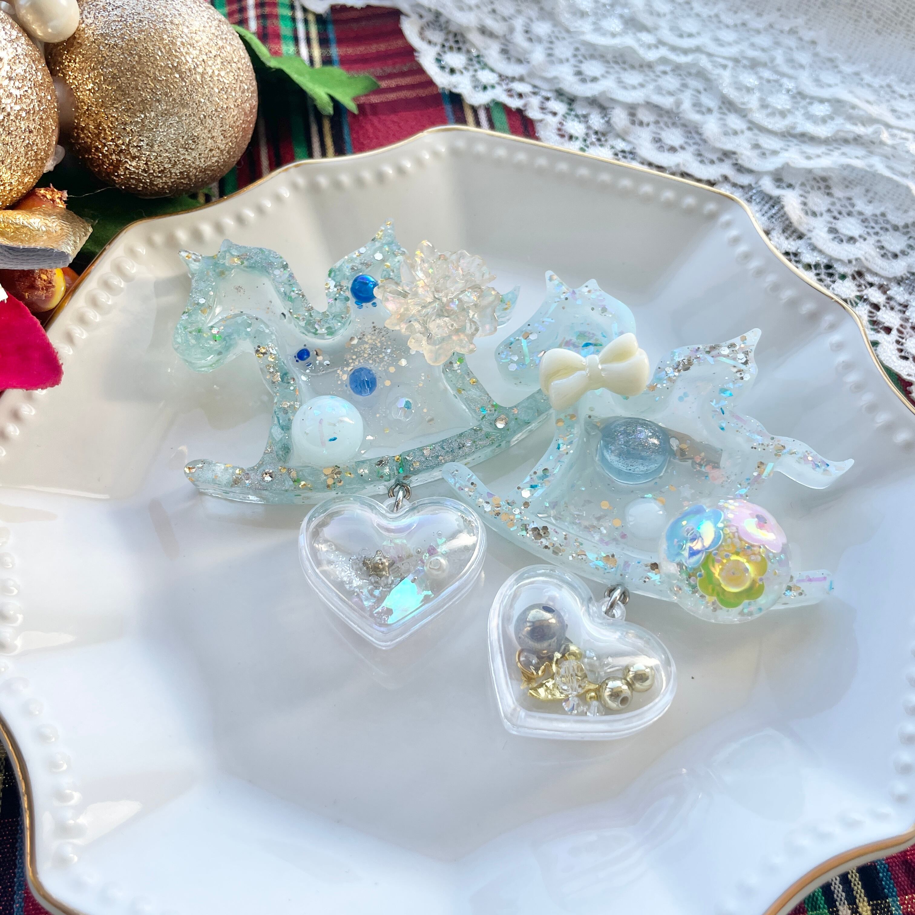 クリスマスツリーのオーナメントをイメージしたハートのチャームがシャカシャカ揺れてとても可愛いです。