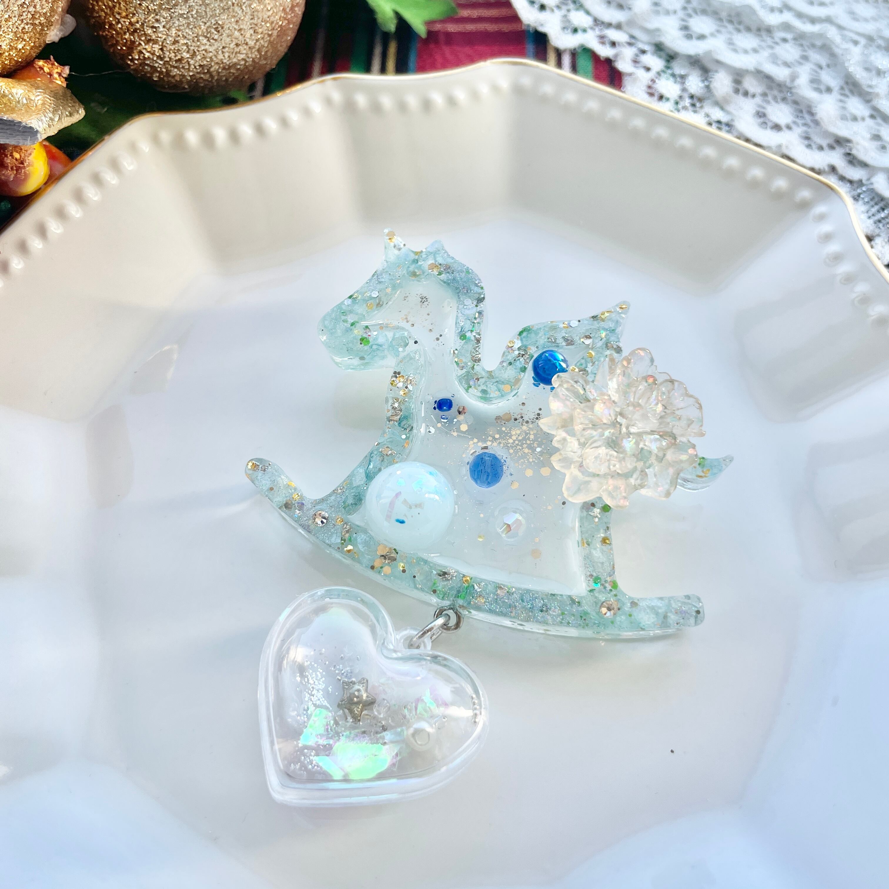 ユニコーン水玉とお花ブローチ【クリスマス】