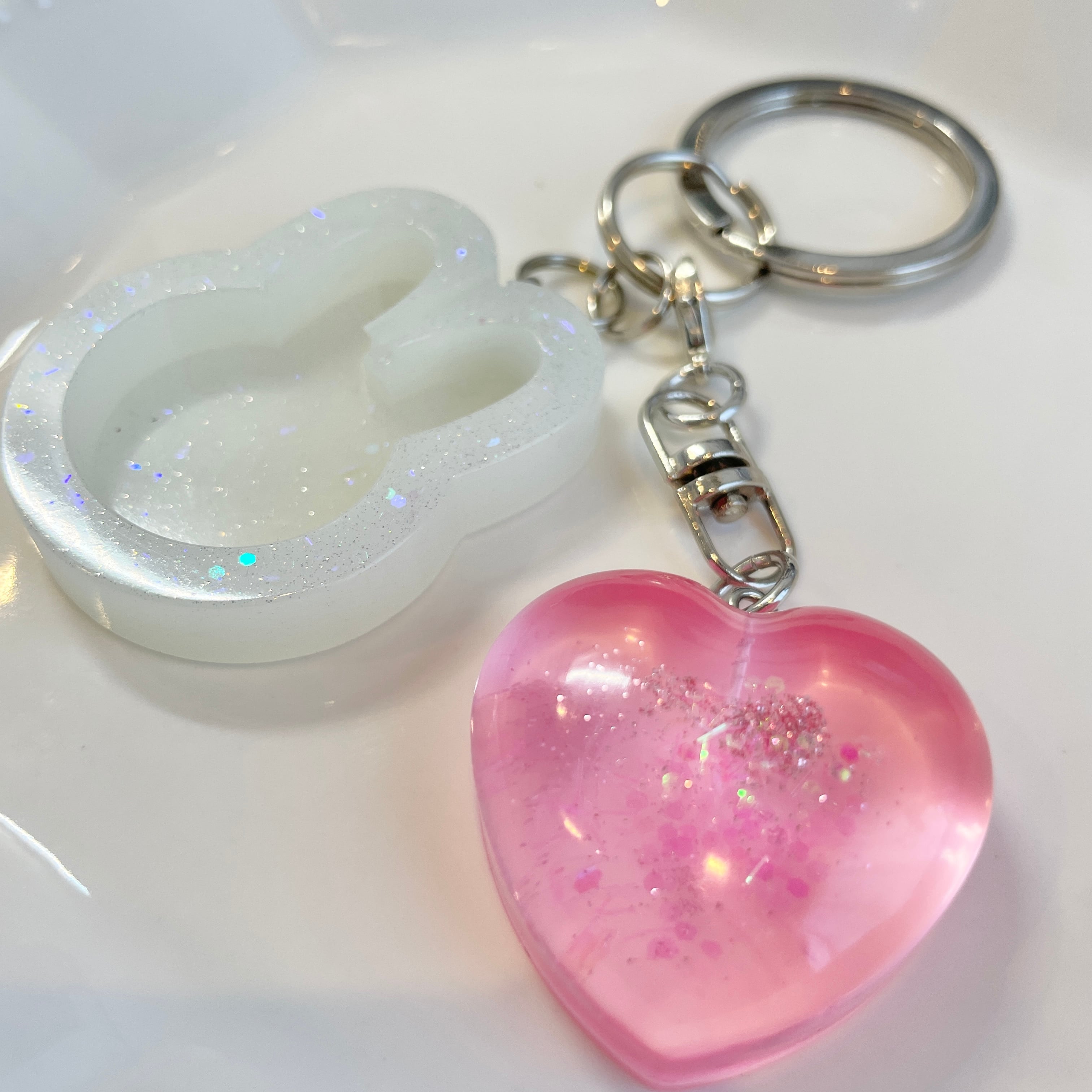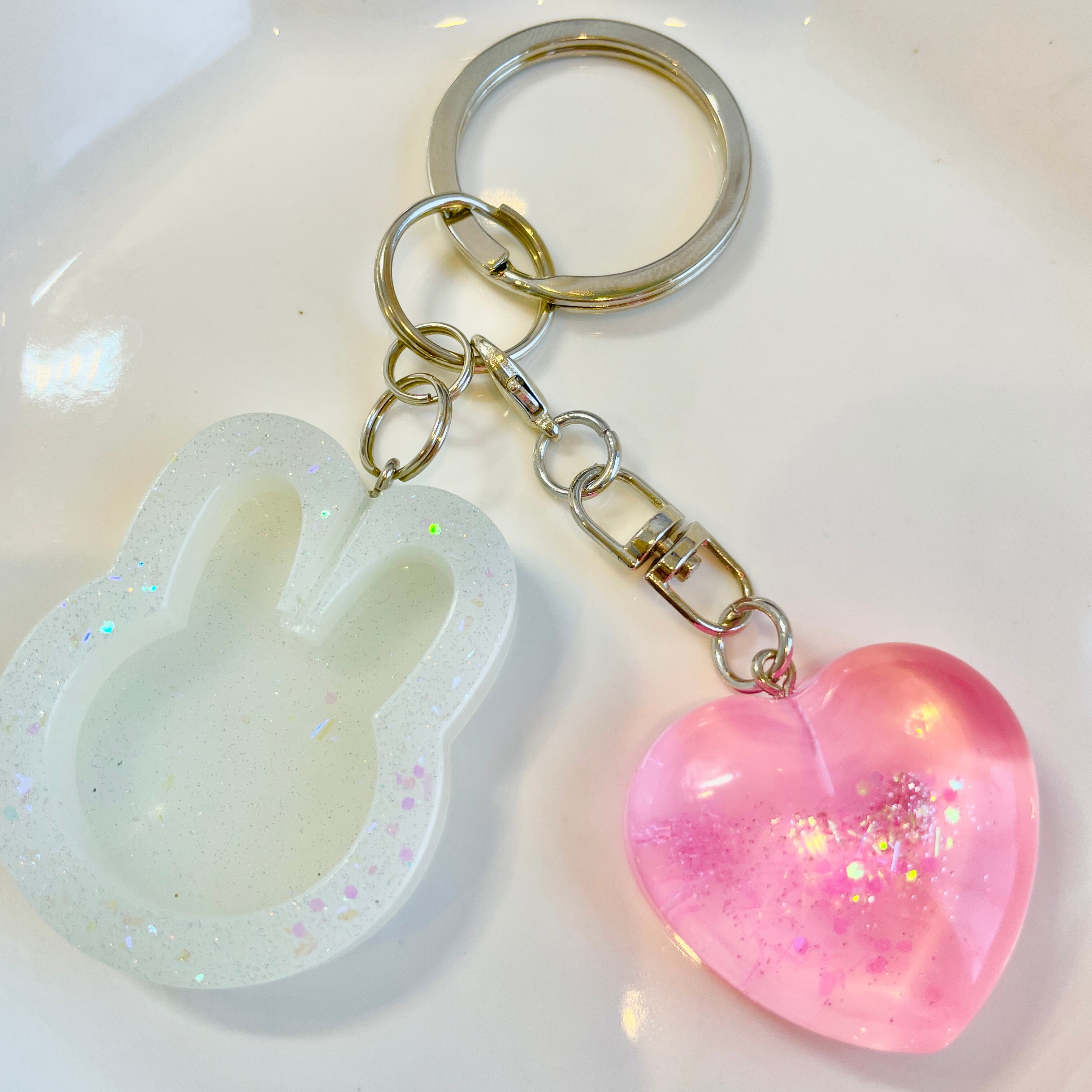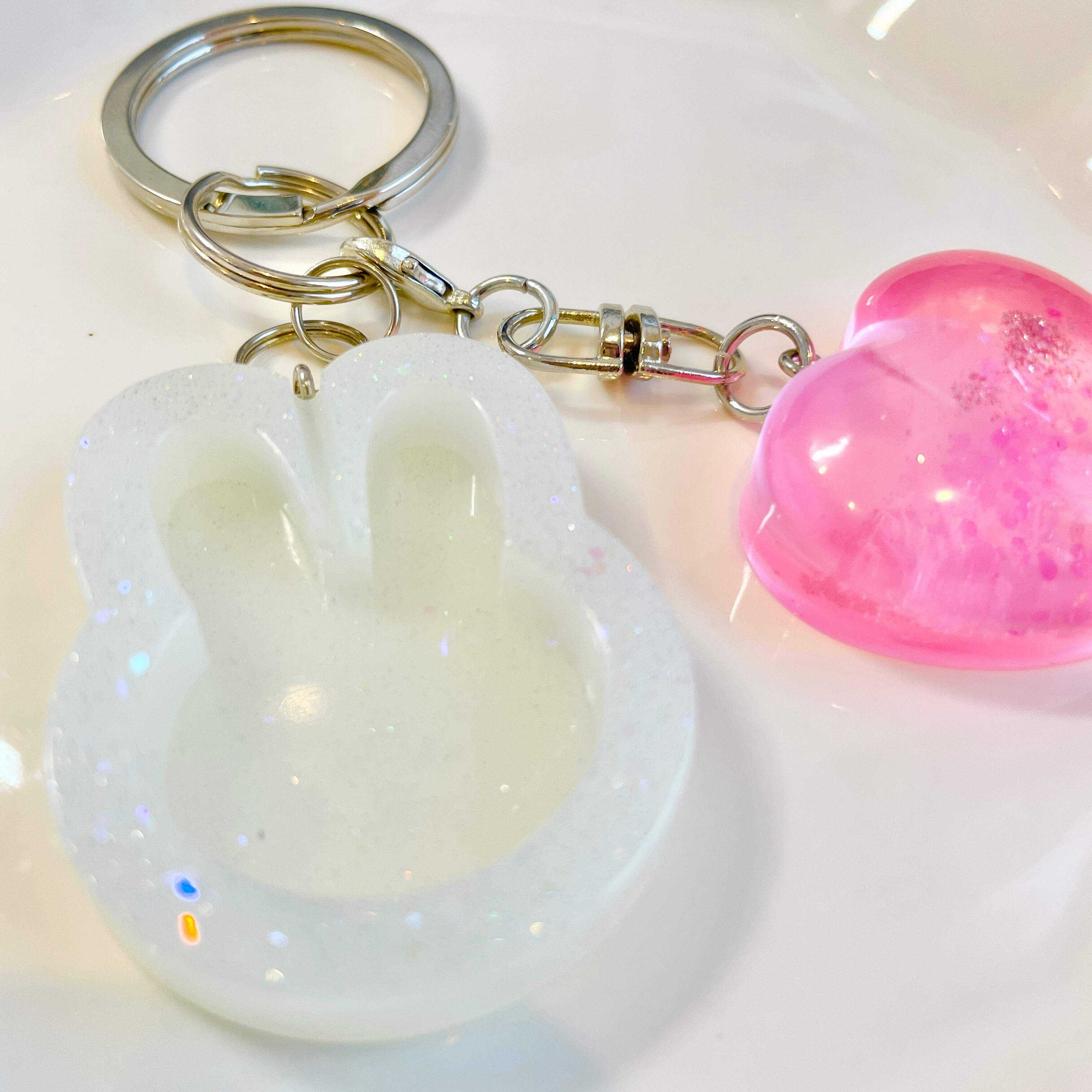 うるうるしたうさぎと、ぷっくりつやつやのピンクハートのキーホルダーです。