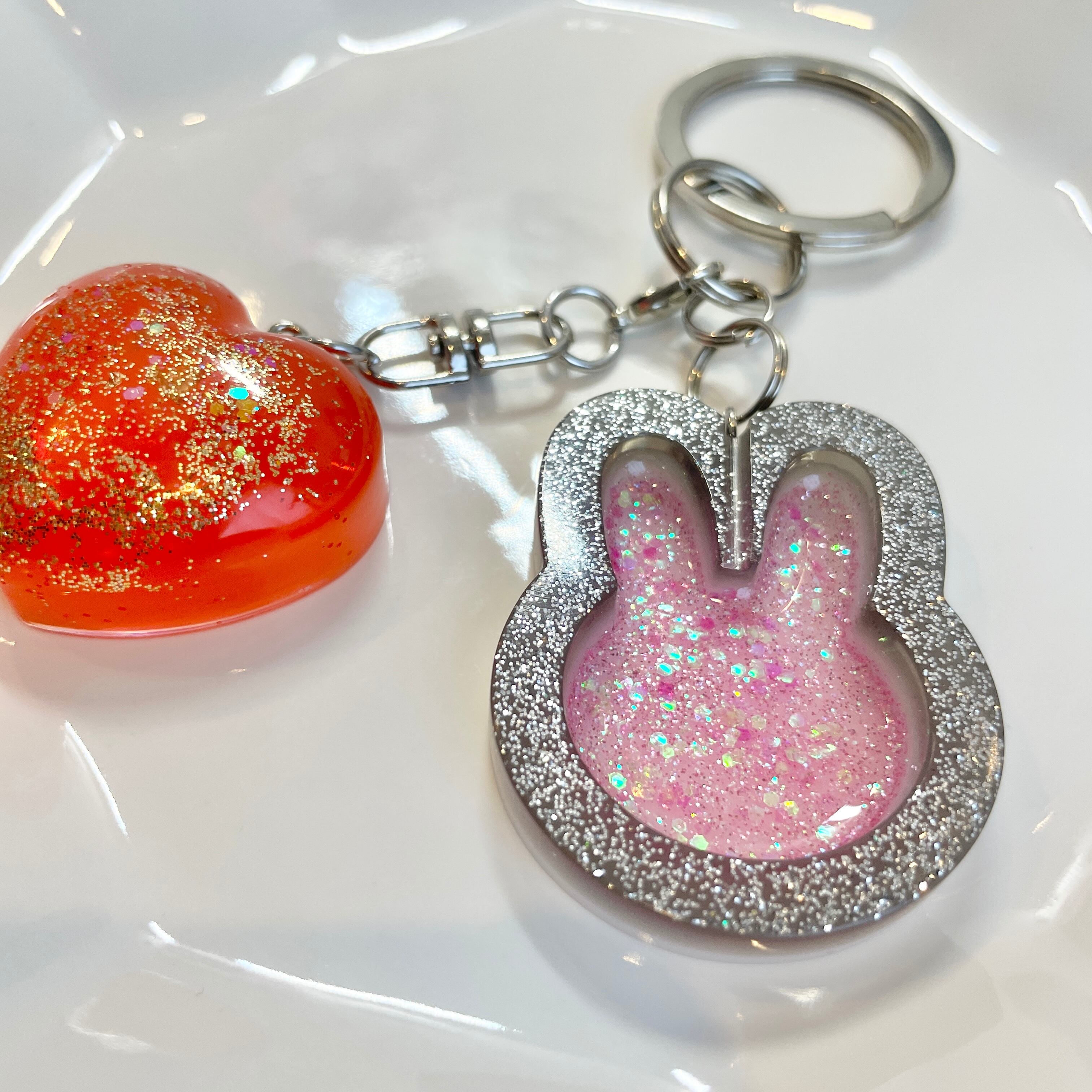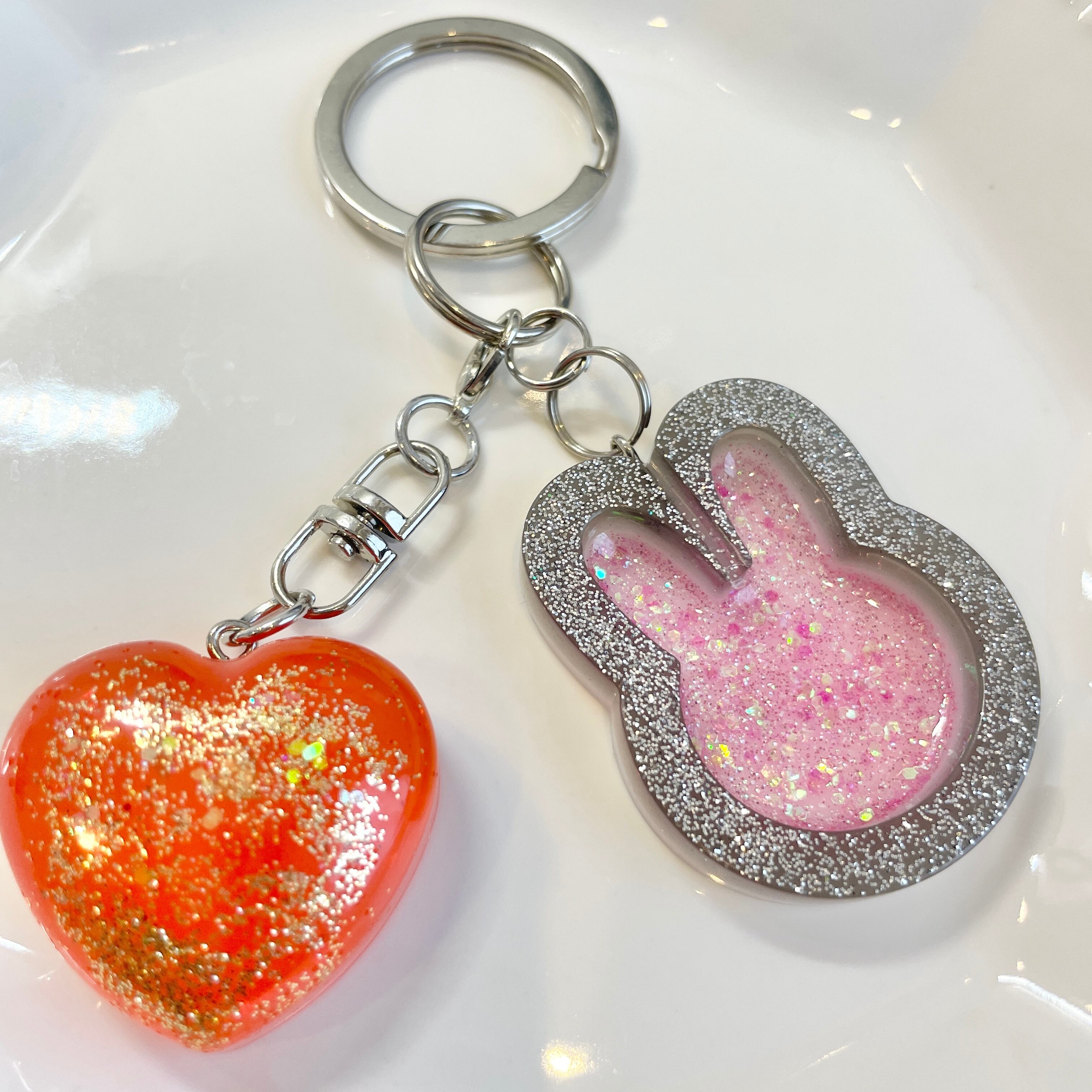宇宙をとじこめたようなギラッギラのラメが綺麗な黒うさぎと、チャイナ風のアセロラレッドハートのキーホルダーです。