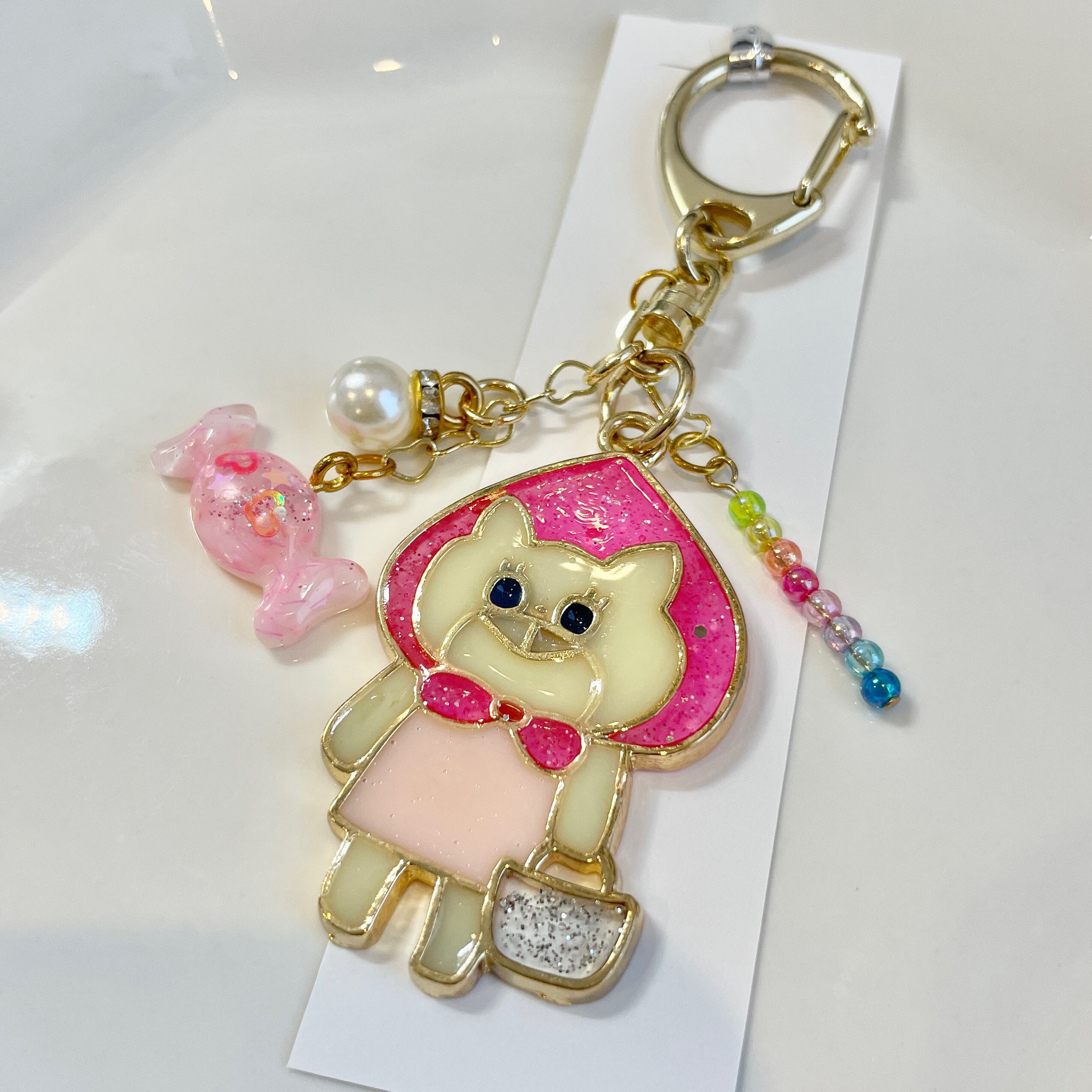ずきんをかぶった苺色の猫のキーホルダーです。