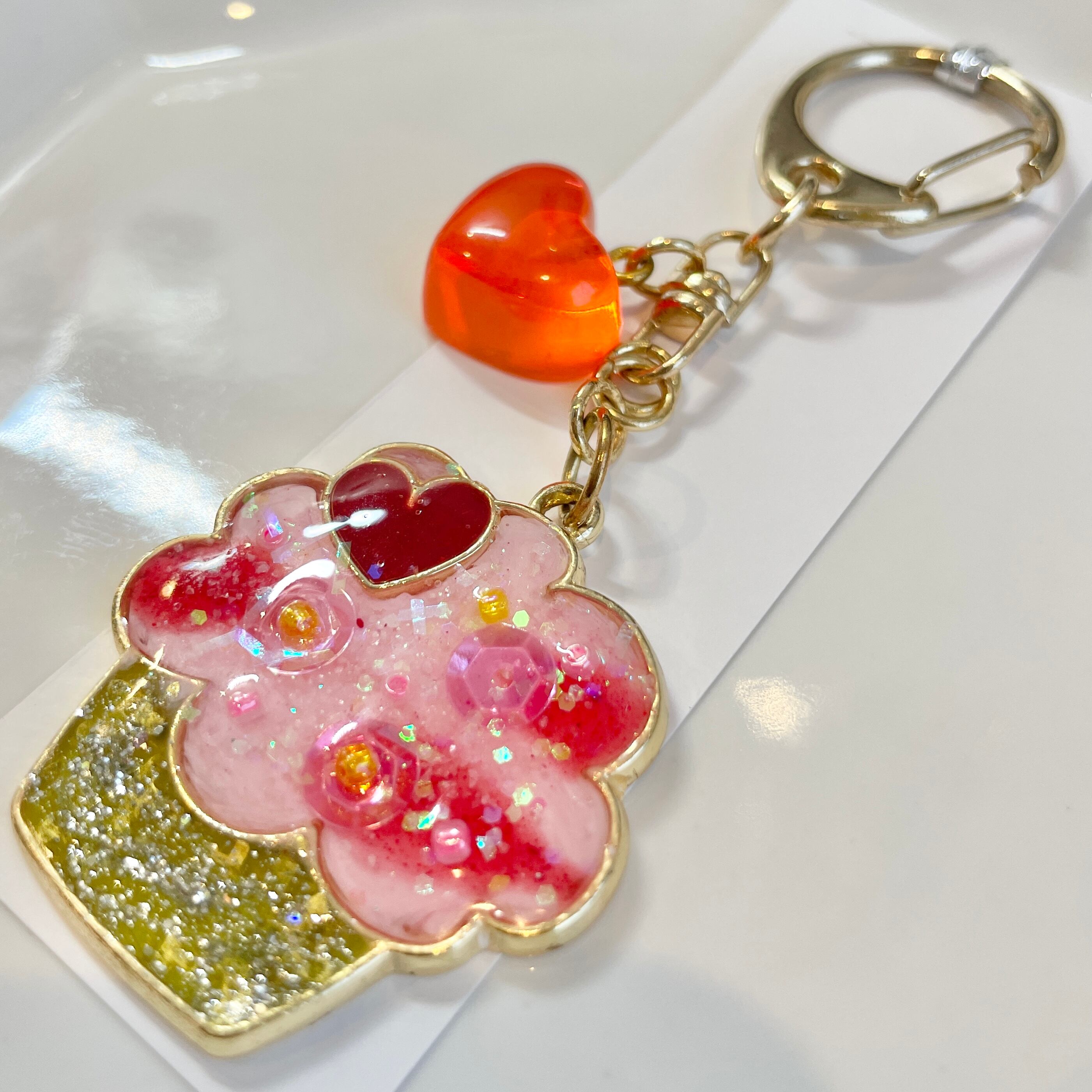 もこもこのカップケーキに、ストロベリーソースをトッピングしたキラキラのキーホルダーです。
