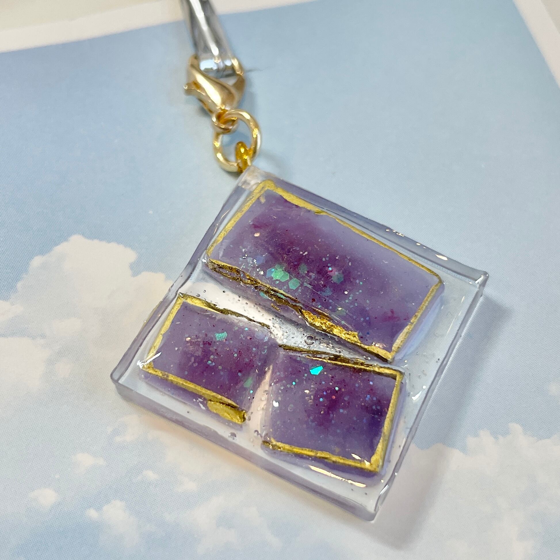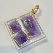 紫色の、まるで鉱石のようなチャームです。 ラメの輝きをいろんな角度から見て楽しめます。
