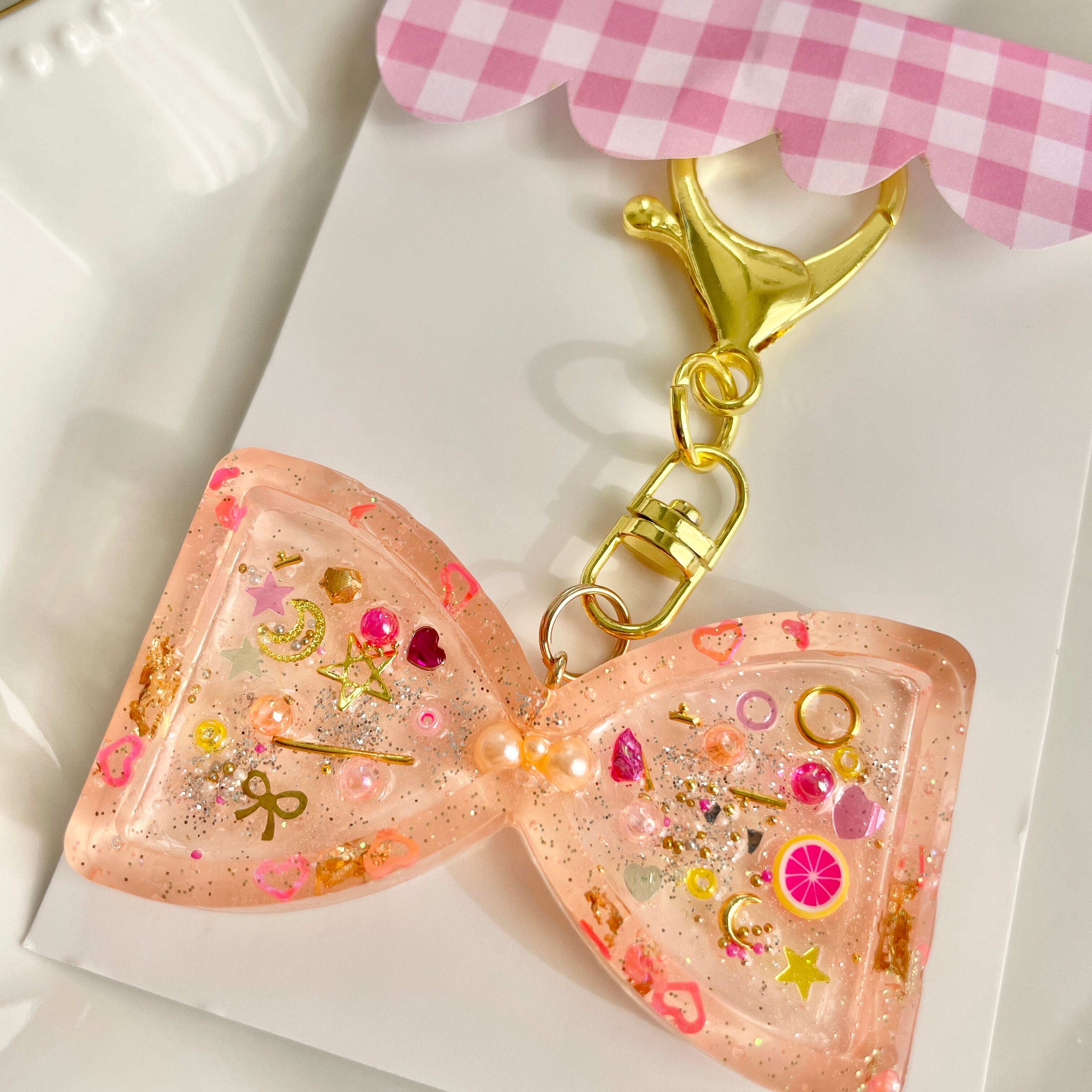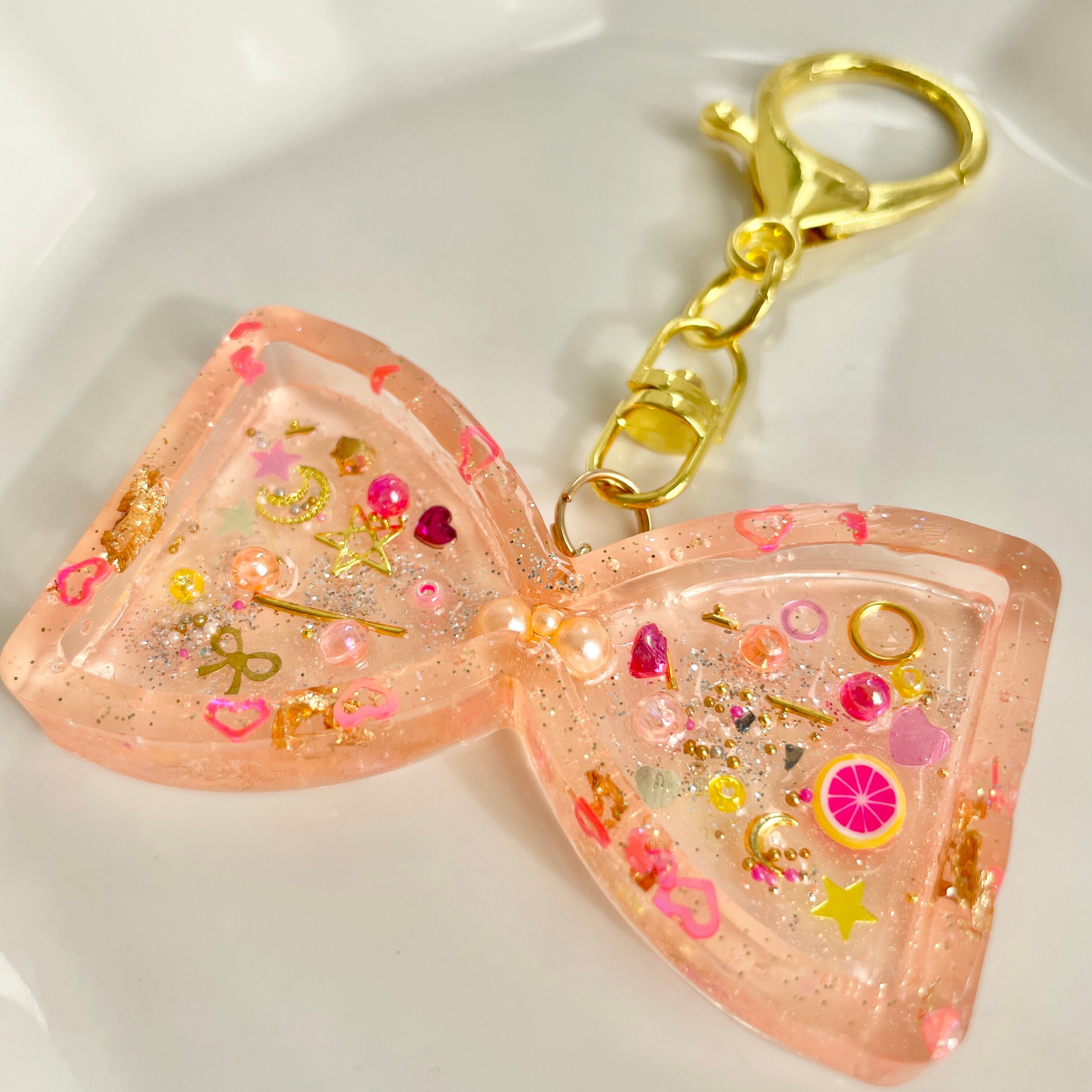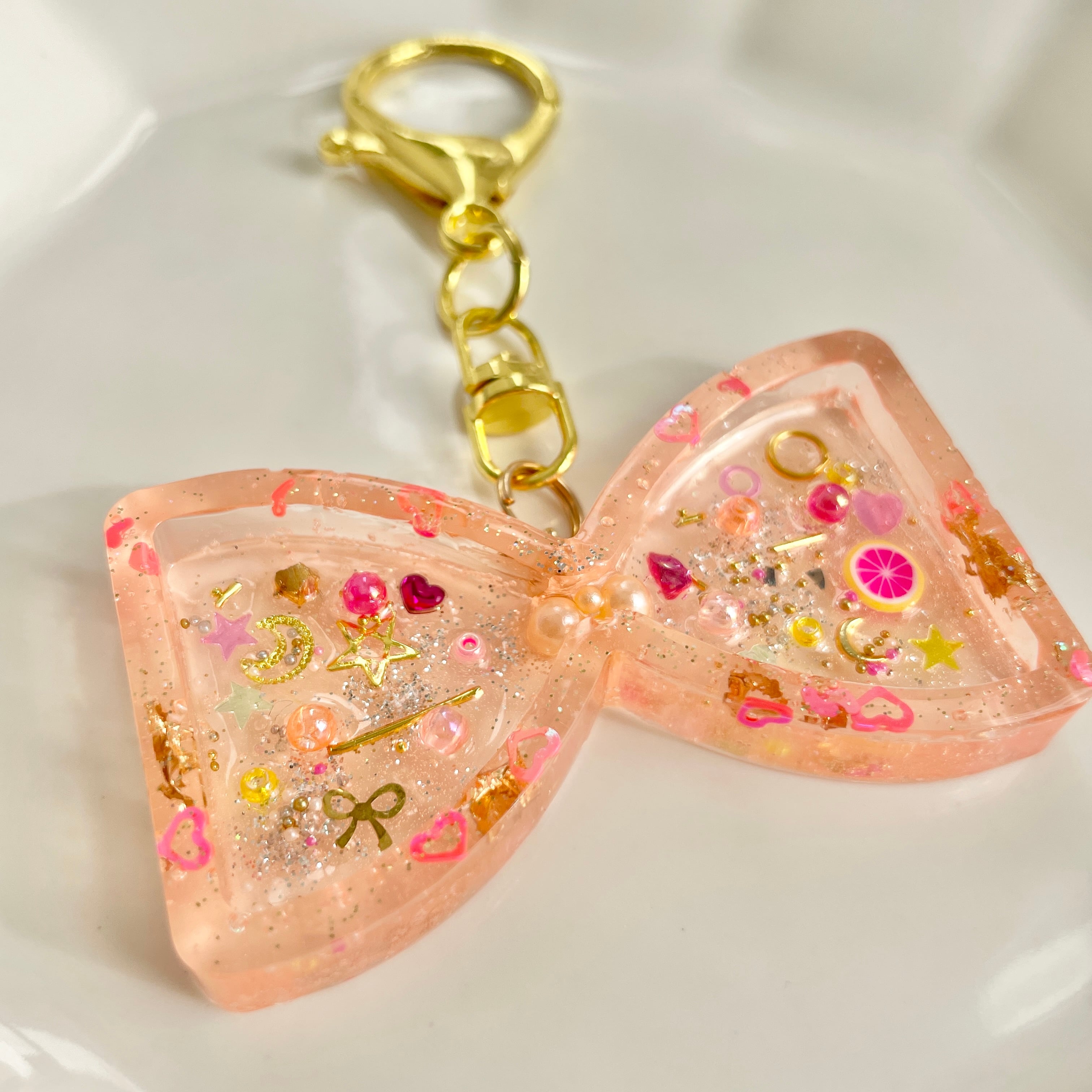 グレープフルーツのようなオレンジ味のあるピンクのりぼん型に、キラキラをつめこみました。