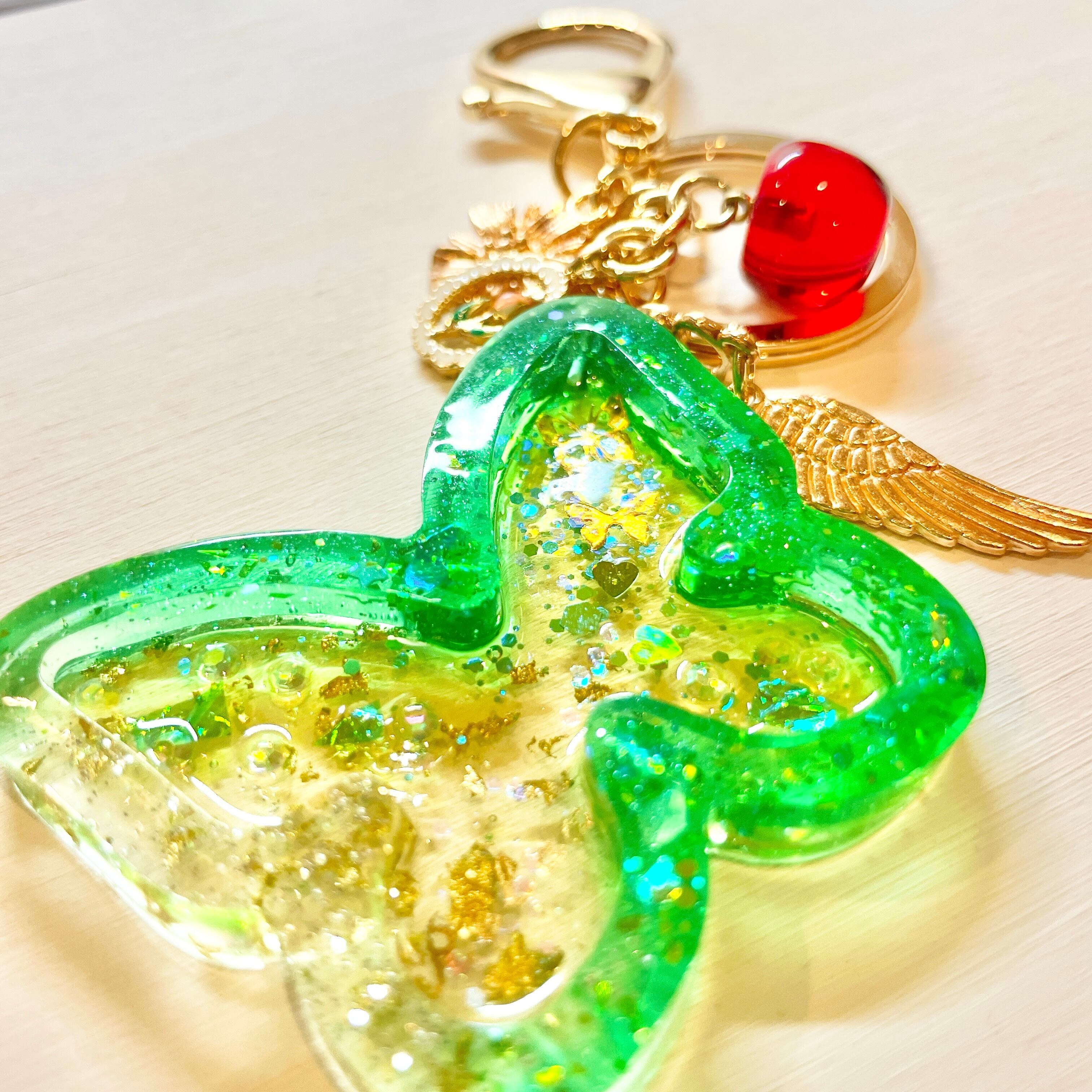 レジン部分(ちょうちょ)にはラメがたくさん入っていてキラキラ眺めるのが楽しいキーホルダーです♪