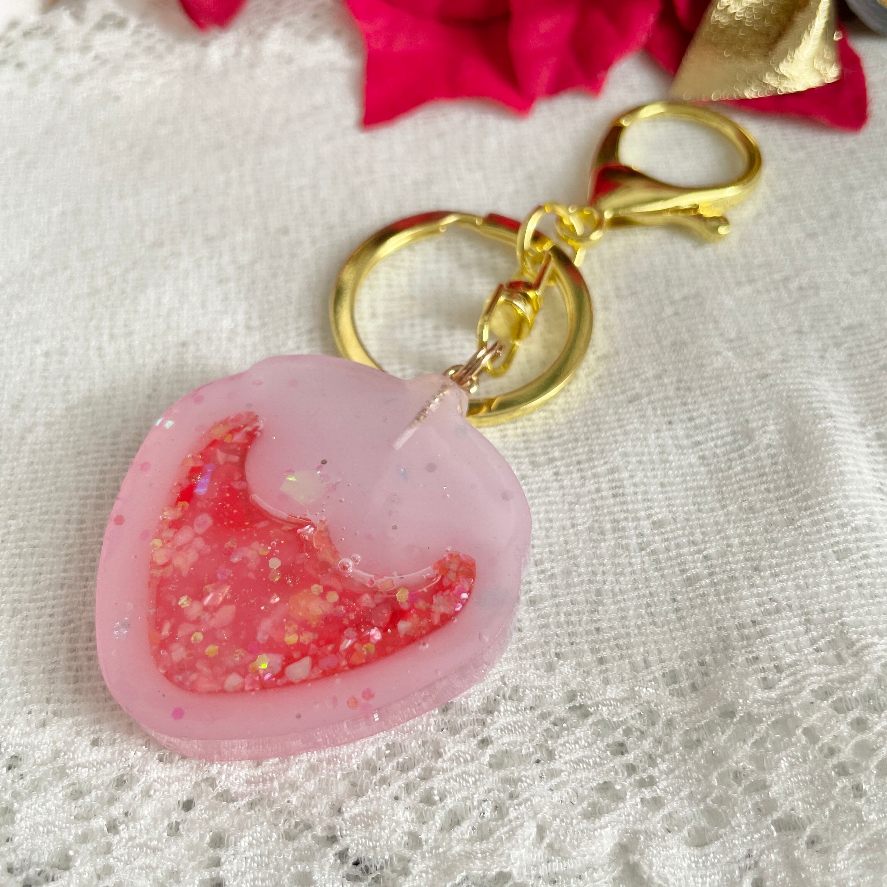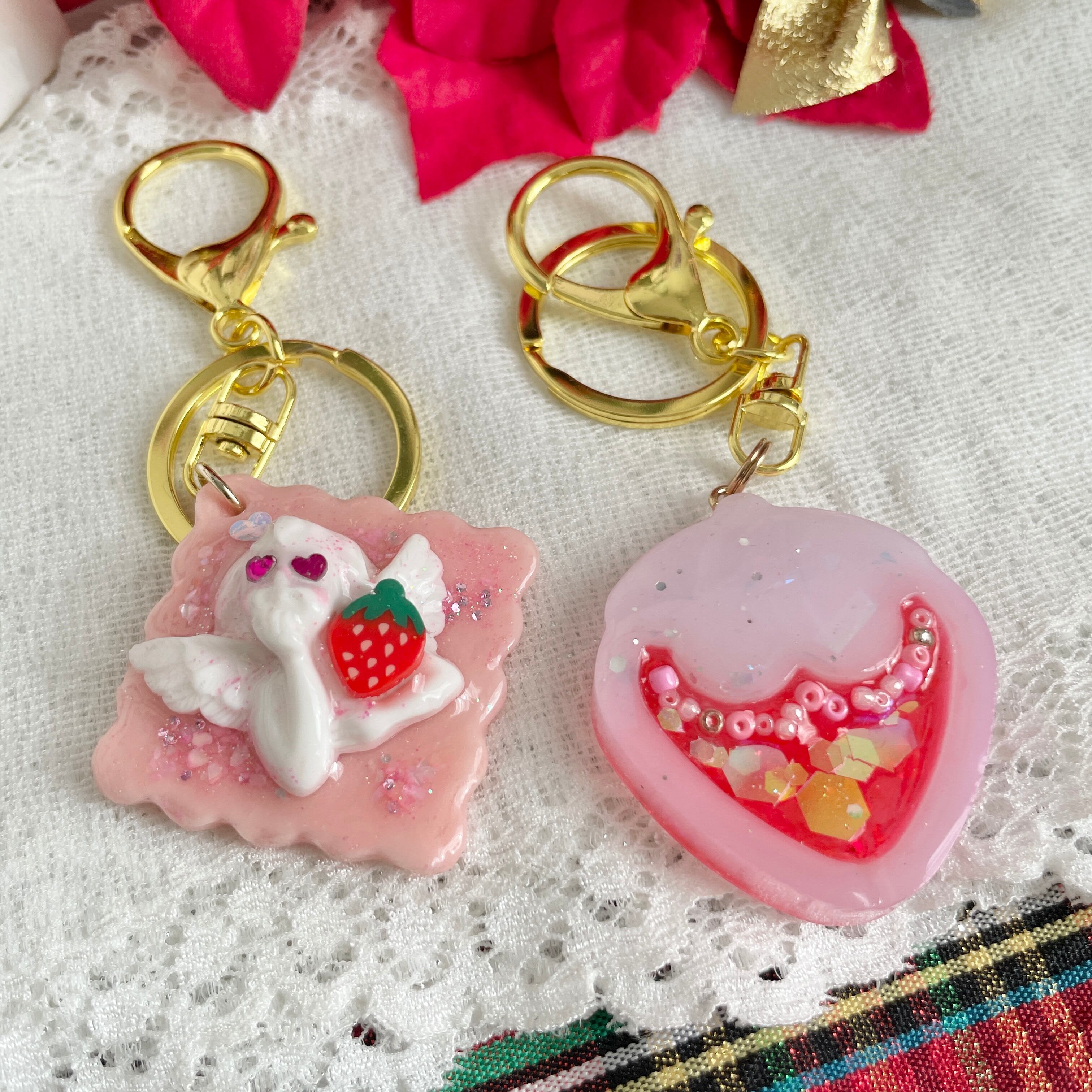 冬の季節感を存分に楽しめる、キュートなピンクいちごのデザインを施したキーホルダー。
